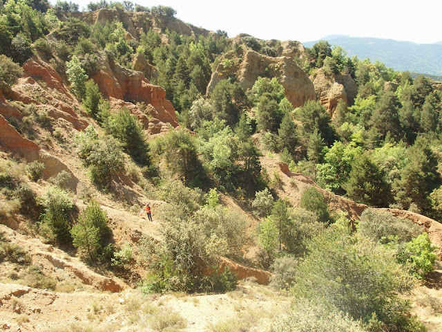 Mentre troto en lleugera pujada pels camps, penso quina és la millor opció per anar fins a la 5. Per dalt o per baix ? De moment anar per baix m'ha donat bons resultats, per tant aquesta serà la meva tria. Un cop s'acaben els camps entro dins el torrent. Si sóc capaç de seguir-lo sense errades, m'ha de portar fins la fita, però no resulta tan fàcil. Encaixonat dins del torrent vaig prenent decisions. Crec que he arribat a la bifurcació on tinc que prendre el torrent de l'esquerra. Després a casa veure que m'he precipitat. Comencen de nou els dubtes mentre m'enfilo amunt. No trobo la fita. Alguna errada he comès. Haig de sortir a dalt i des d'allà reorientar-me i decidir. No és fàcil pujar per aquestes zones relliscoses de terra, però arribo al corriol de la part de dalt dels xaragalls. He sortit molt a l'Oest de la fita. Un cop aquí no em resulta massa complicat arribar fins a la fita. He perdut força temps.